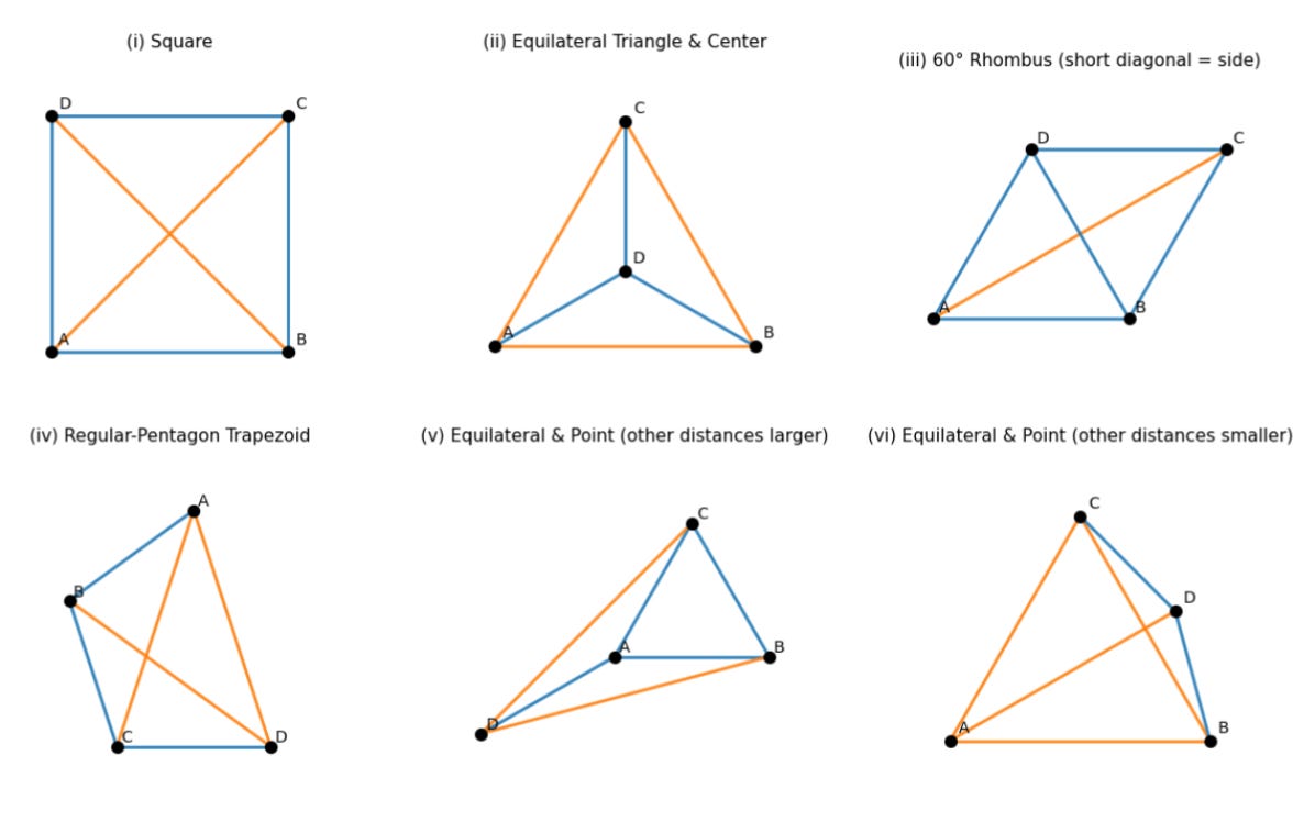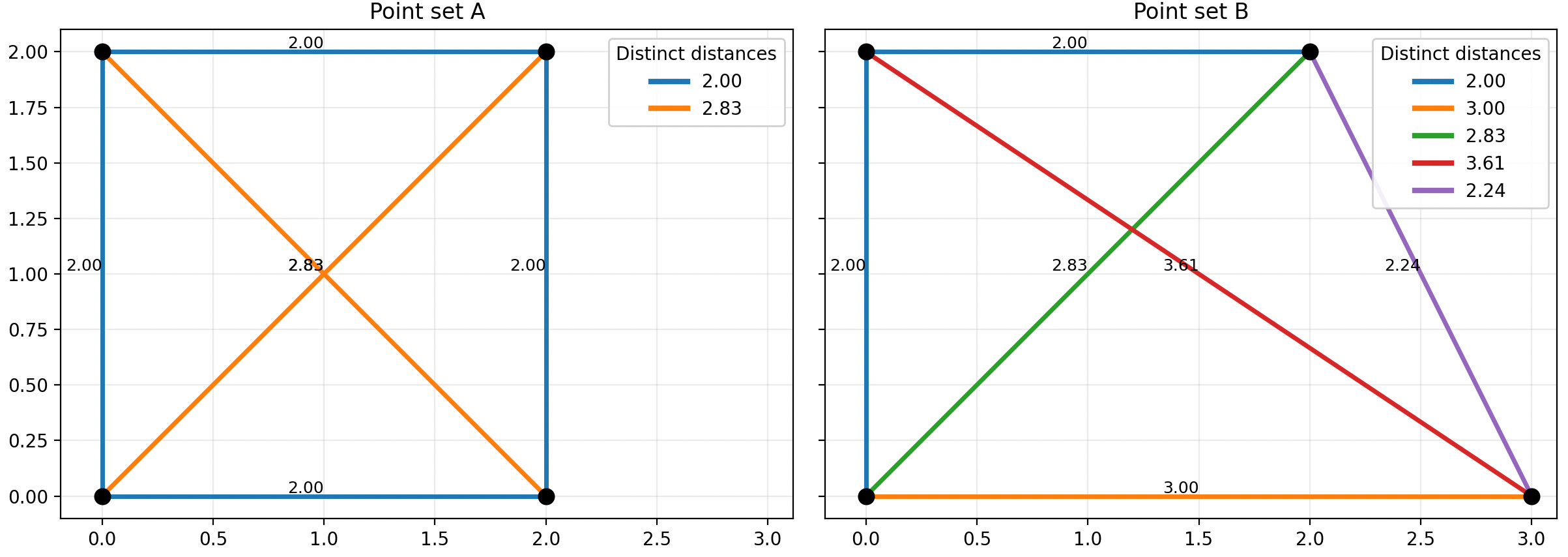 For one example: the set of points [(0, 0), (2, 0), (0, 2), and (2, 2)] make a square with two “distinct distances:” the edge and the diagonal. But if we swap out the point (2, 0) for (3, 0), we now have five distinct distances: