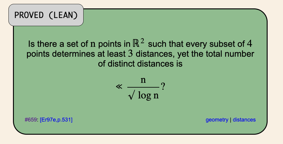 This problem focuses on distances and points, and particularly the idea of “distinct distances” within a collection of points. We say that a set of points has “distinct distances” equal to the number of unique distances between points in the set.