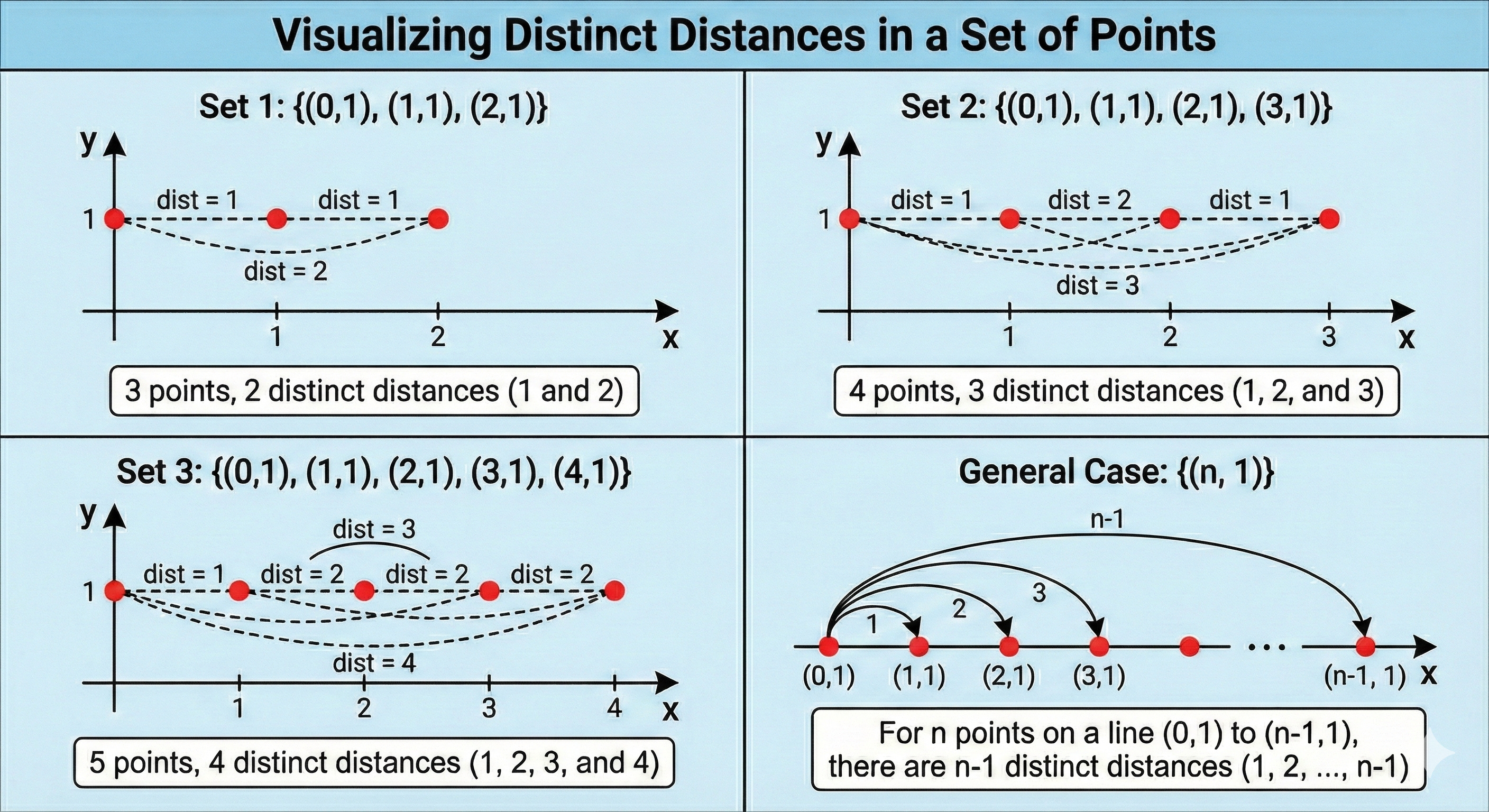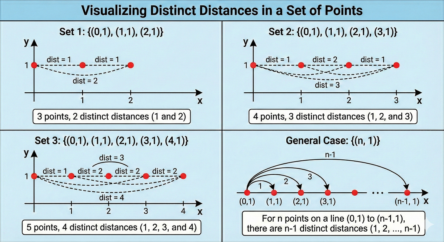 What does this mean? The set [(0,1), (1,1), (2,1)] has 2 distinct distances. If I add (3,1) I have 3 distinct distances, and with (4,1) I now have 4.